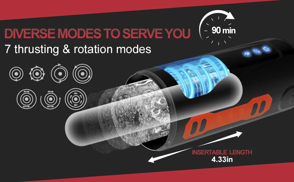 1. Male Masturbator with 7 Thrusting & Spinning Modes: This male masturbator cup features a high quality rotating motor and exquisite workmanship, the use of ball bearing rotation eliminates the problem that similar products on the market are prone to-jams that are very painful. The movement and rotation combine for a great sensational sexual experience.
